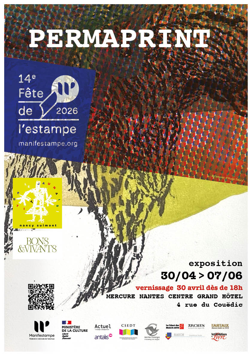 exposition Invitation au vernissage le 30 avril à partir de 18h dans le bar lounge du Grand Hotel Mercure rue du Couëdic à Nantes PERMAPRINT les focus de Manifestampe formation professionnelle Façonnages : leporello, portefolio, boite 26 au 30 mai 2026 cinq journées pour couper, plier, coller… papiers, tissus, cartons pour valoriser, organiser et présenter ses œuvres. Il reste 2 places !! lien vers la description formation professionnelle De la lithographie au livre 15 au 19 puis du 22 au 26 juin 2026 dix journées pour se perfectionner aux techniques de la lithographie sur pierres et du façonnage, reliure pour réaliser leporello, livres, portefolio en manipulant papier, carton, tissu. La formation se déroule dans un ancien hôtel à Savennières (49). Il reste 1 place !!!! Lien vers la description ![]() Merci à toi lecteurice, pour ton attention et à tant tôt ! Nancy de Nantes | |||