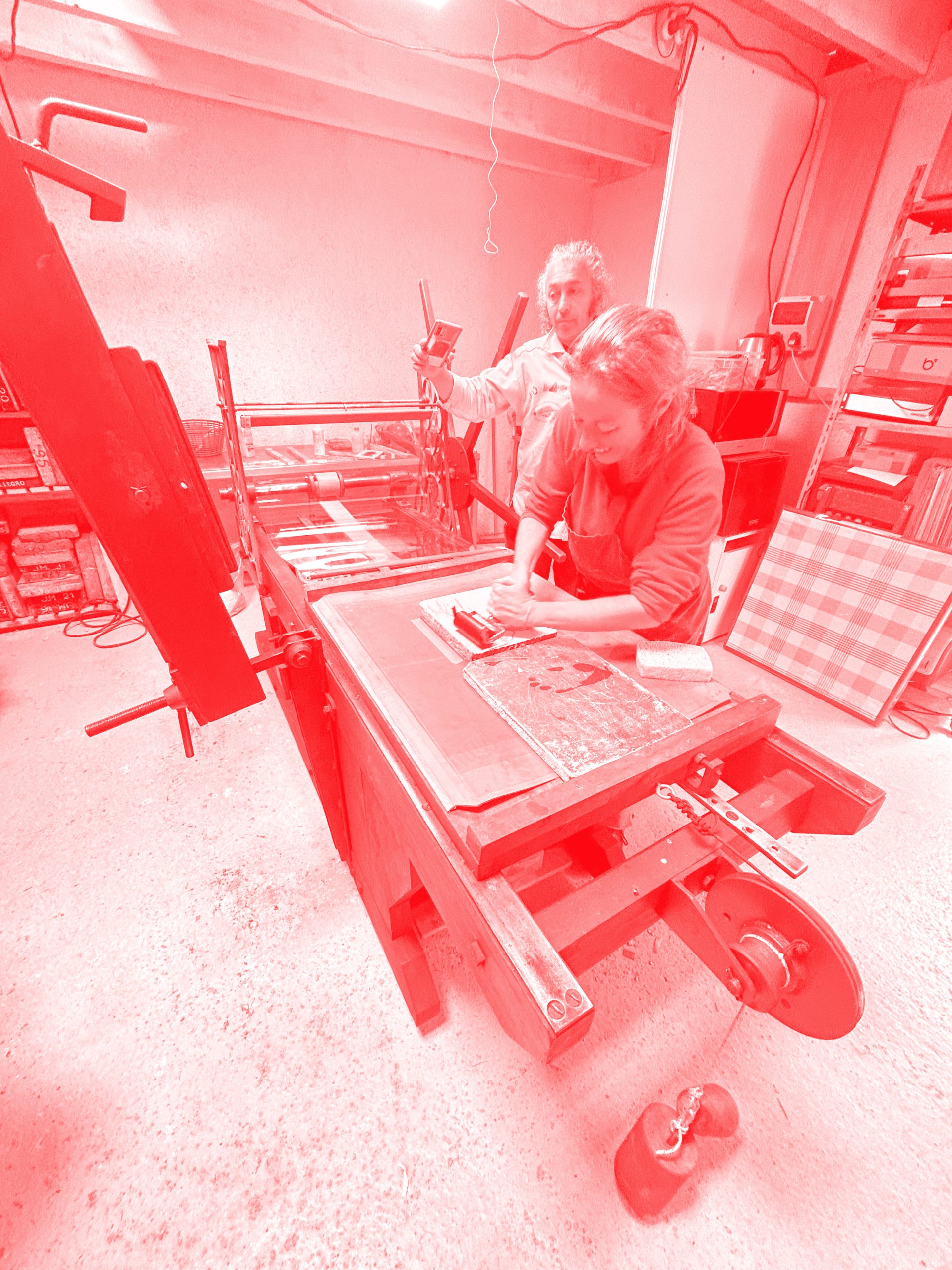 Le stage se déroule dans l’atelier Taller Lorem Ipsum à Roc’hCreiz au sud de Morlaix (Finistère) avec le matériel spécialisé d’impression du petit jaunais.